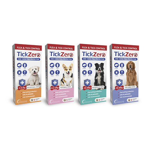TickZero™ es un comprimido masticable de Fluralaner destinado a uso oral y debe administrarse según el peso corporal del perro. Como tratamiento contra garrapatas basado en el peso del perro, est á disponible en cuatro concentraciones para simplificar la dosificación precisa en distintas razas y tamaños.